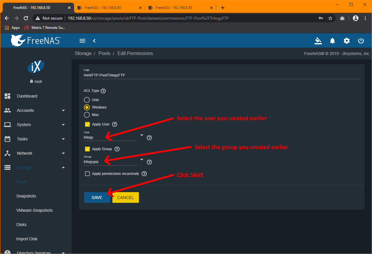 We're now going to change the permissions on the Dataset you created for the user so they have the rights to add and delete data. From your FreeNAS options menu on the left select Storage > Pools. Then expand the Pool that contains the Dataset we created earlier and follow the screenshots below: